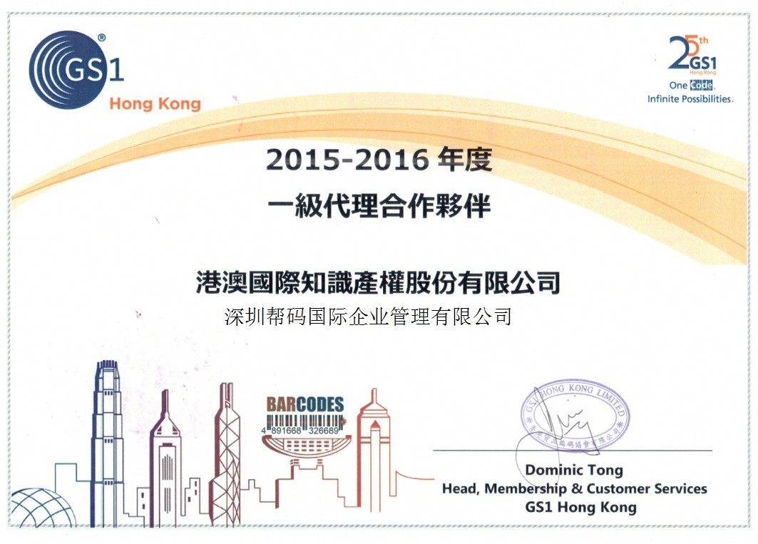 港澳集团-帮码国际获得香港货品编码协会颁发【一级代理合作伙伴】荣誉;